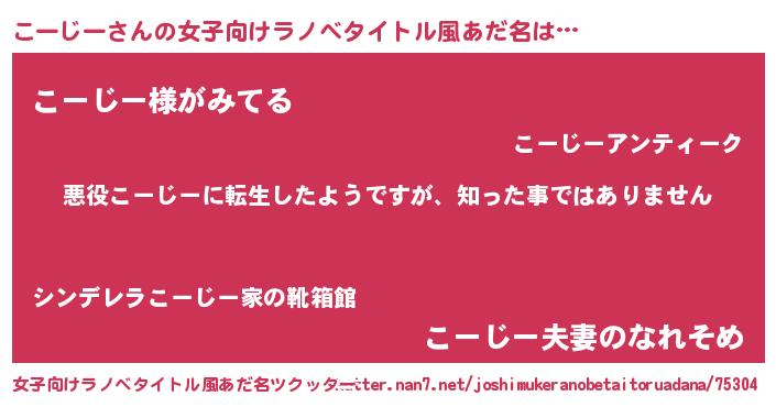 こーじーさんの女子向けラノベタイトル風あだ名は… 『悪役こーじーに転生したようですが、知った事ではありません』『こーじー様がみてる』『こーじー夫妻のなれそめ』 ツクッター #女子向けラノベタイトル風あだ名ツクッター http://tkutter.nan7.net/joshimukeranobetaitoruadana/75304/