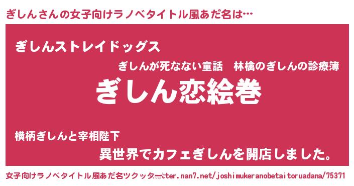 | 男性向けラノベタイトル風あだ名 | 『おまえをオタクにしてやるから、俺をぎしんにしてくれ! 』 |