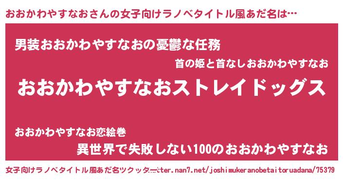 | 男性向けラノベタイトル風あだ名 | 『Re:おおかわやすなおから始める異世界生活』 |