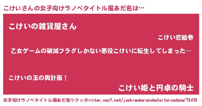 | 男性向けラノベタイトル風あだ名 | 『魔弾の王とこけい』『こけいの憂鬱』 |