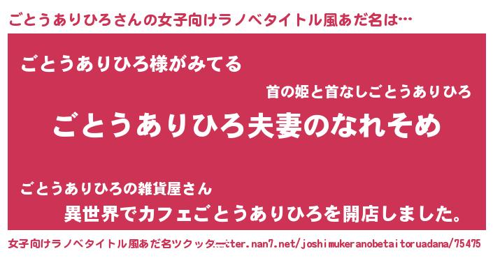 | 男性向けラノベタイトル風あだ名 | 『おまえをオタクにしてやるから、俺をごとうありひろにしてくれ! 』 |