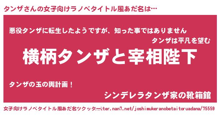 | 男性向けラノベタイトル風あだ名 | 『タンザに滅ぼされるだけの簡単なお仕事です』 |
