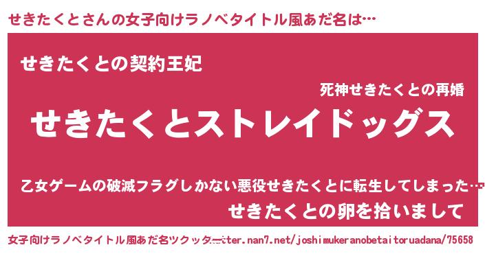 | 男性向けラノベタイトル風あだ名 | 『Re:せきたくとから始める異世界生活』 |