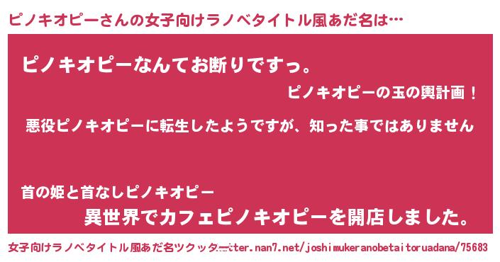 | 男性向けラノベタイトル風あだ名 | 『この素晴らしい世界にピノキオピーを!』 |