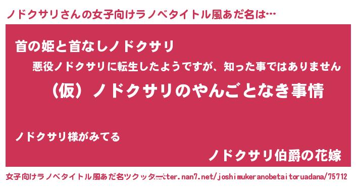 | 男性向けラノベタイトル風あだ名 | 『ノドクサリの憂鬱』 |