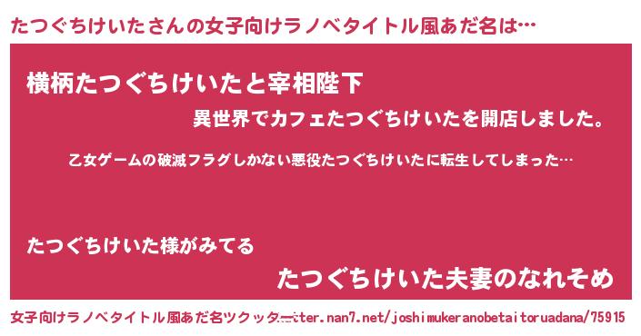 | 男性向けラノベタイトル風あだ名 | 『魔弾の王とたつぐちけいた』 |