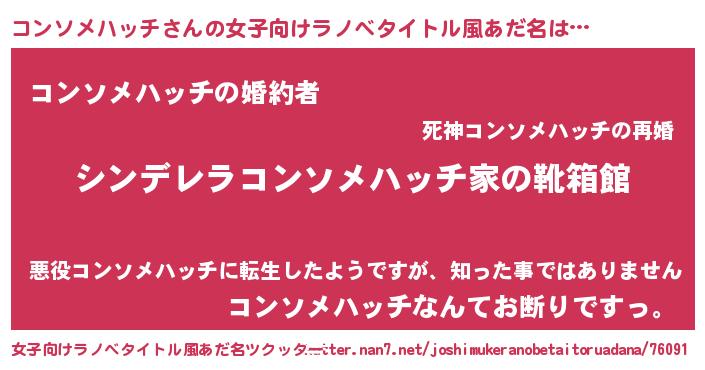 | 男性向けラノベタイトル風あだ名 | 『冴えないコンソメハッチの育てかた』 |