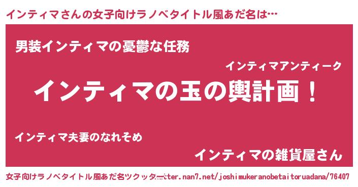 | 男性向けラノベタイトル風あだ名 | 『インティマ~年齢イコール彼女いない歴の魔法使い~』 |