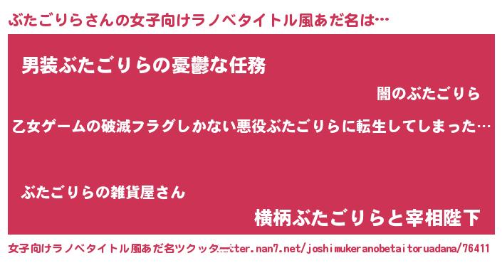 | 男性向けラノベタイトル風あだ名 | 『この素晴らしい世界にぶたごりらを!』 |