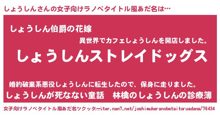 | 男性向けラノベタイトル風あだ名 | 『Re:しょうしんから始める異世界生活』 |