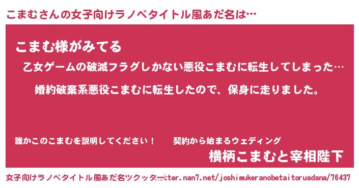 | 男性向けラノベタイトル風あだ名 | 『転生したらこまむだった件』 |