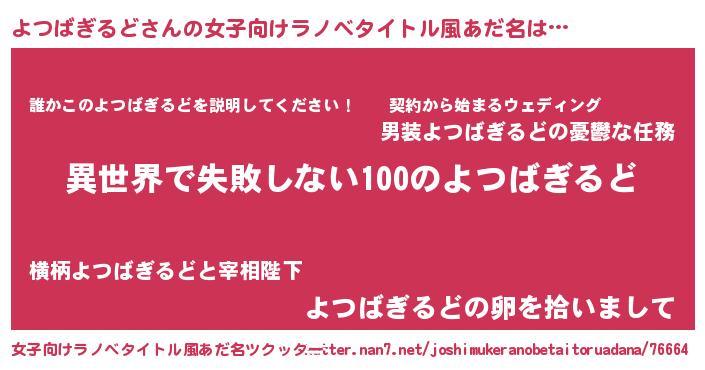 よつばぎるどさんの女子向けラノベタイトル風あだ名は… 『異世界で失敗しない100のよつばぎるど』『誰かこのよつばぎるどを説明してください! ~契約から始まるウェディング~』『よつばぎるどの卵を拾いまして』 ツクッター #女子向けラノベタイトル風あだ名ツクッター http://tkutter.nan7.net/joshimukeranobetaitoruadana/76664/