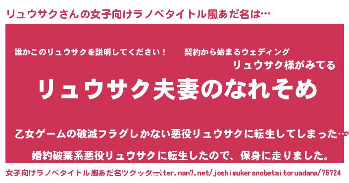 | 男性向けラノベタイトル風あだ名 | 『おまえをオタクにしてやるから、俺をリュウサクにしてくれ! 』 |