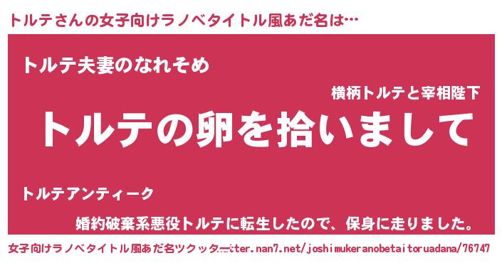 | 男性向けラノベタイトル風あだ名 | 『トルテの嫁は女の子じゃないと思った?』 |