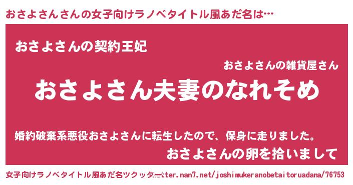 | 男性向けラノベタイトル風あだ名 | 『おまえをオタクにしてやるから、俺をおさよさんにしてくれ! 』 |