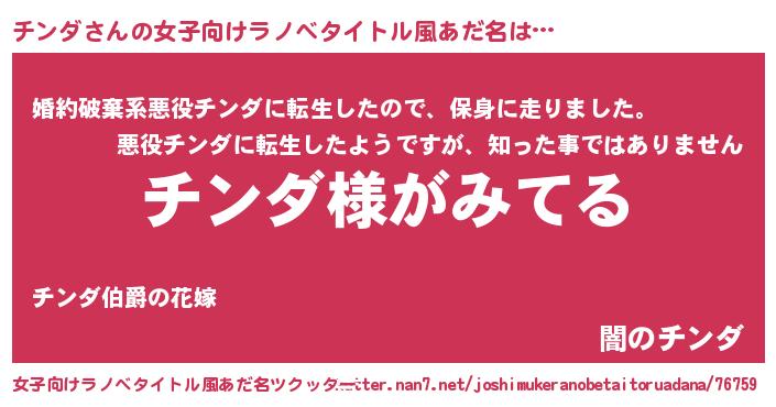 | 男性向けラノベタイトル風あだ名 | 『チンダの嫁は女の子じゃないと思った?』 |