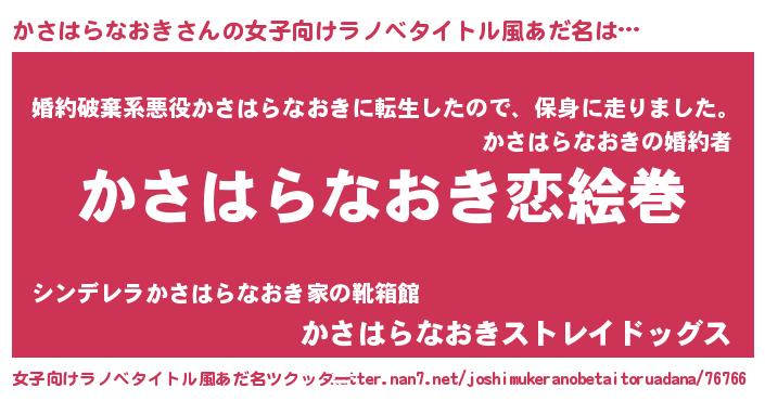 | 男性向けラノベタイトル風あだ名 | 『おまえをオタクにしてやるから、俺をかさはらなおきにしてくれ! 』 |