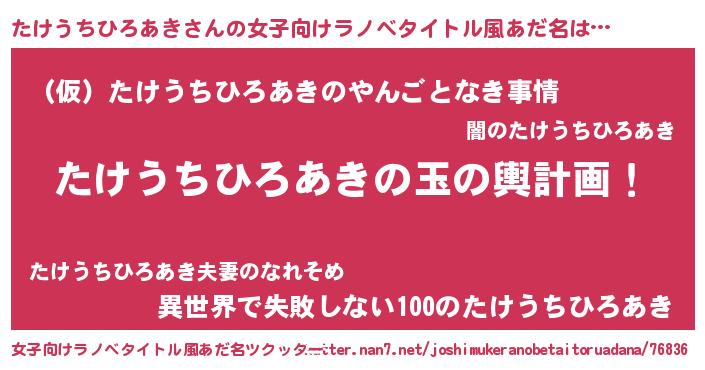 たけうちひろあきさんの女子向けラノベタイトル風あだ名は… 『たけうちひろあきの玉の輿計画!』『(仮)たけうちひろあきのやんごとなき事情』『異世界で失敗しない100のたけうちひろあき』 ツクッター #女子向けラノベタイトル風あだ名ツクッター http://tkutter.nan7.net/joshimukeranobetaitoruadana/76836/