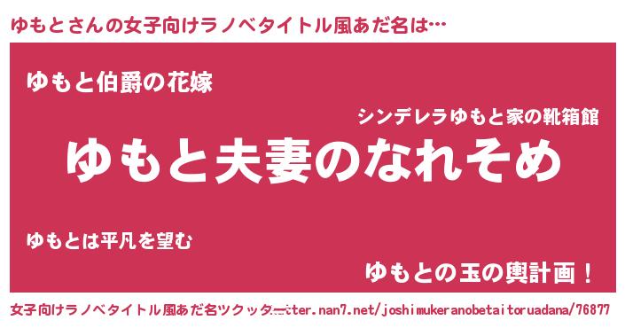 | 男性向けラノベタイトル風あだ名 | 『おまえをオタクにしてやるから、俺をゆもとにしてくれ! 』 |