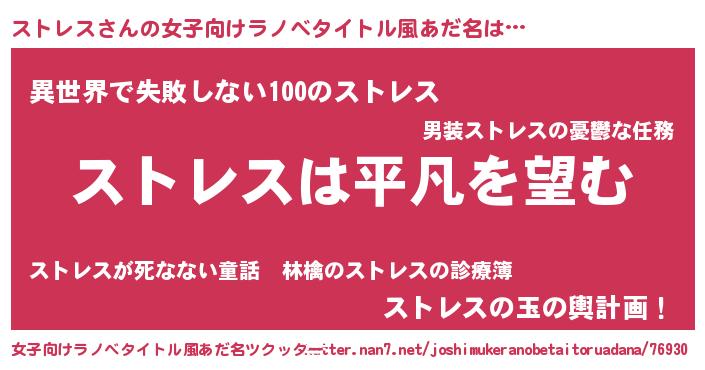 ストレスさんの女子向けラノベタイトル風あだ名は… 『ストレスは平凡を望む』『異世界で失敗しない100のストレス』『ストレスの玉の輿計画!』 ツクッター #女子向けラノベタイトル風あだ名ツクッター http://tkutter.nan7.net/joshimukeranobetaitoruadana/76930/