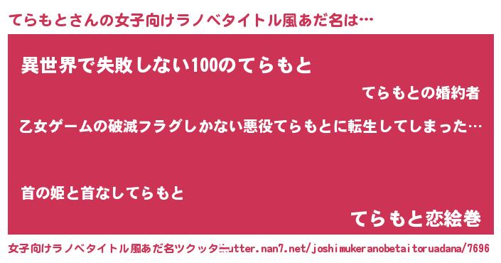 | 男性向けラノベタイトル風あだ名 | 『この素晴らしい世界にてらもとを!』 |