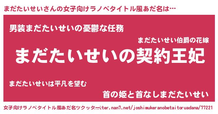 | 男性向けラノベタイトル風あだ名 | 『まだたいせいという概念が存在しない退屈な世界 』 |