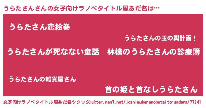 | 男性向けラノベタイトル風あだ名 | 『魔弾の王とうらたさん』 |