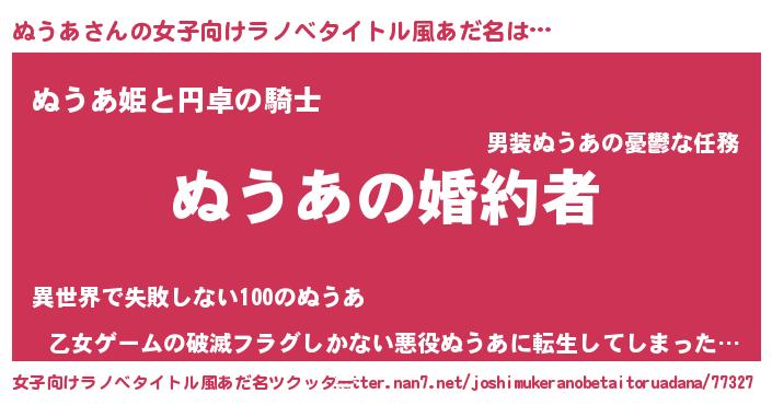 | 男性向けラノベタイトル風あだ名 | 『うちの娘の為ならば、俺はもしかしたらぬうあも倒せるかもしれない。』 |