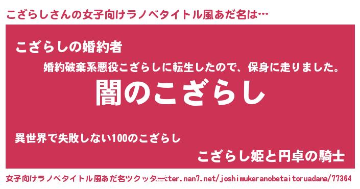 | 男性向けラノベタイトル風あだ名 | 『Re:こざらしから始める異世界生活』 |