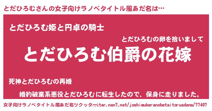 | ファンタジー風あだ名 | 『エターナルトダヒロムー』『トダフェル』 |