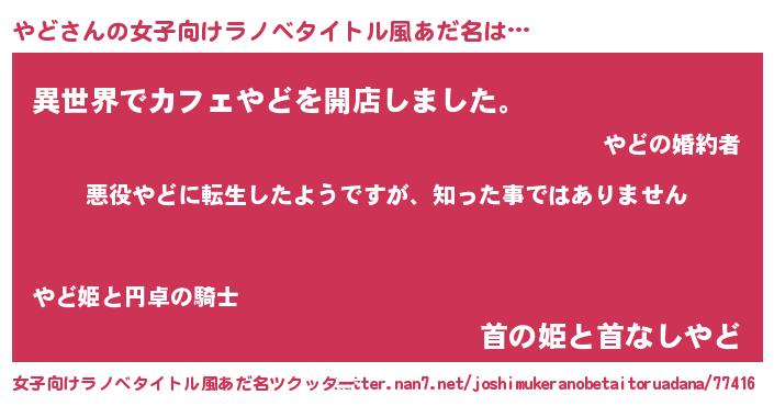 | 男性向けラノベタイトル風あだ名 | 『この素晴らしい世界にやどを!』 |