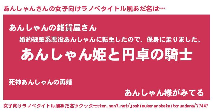 | 男性向けラノベタイトル風あだ名 | 『あんしゃんの憂鬱』 |