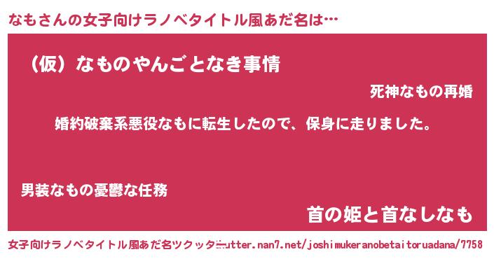 | 男性向けラノベタイトル風あだ名 | 『ナモスレイヤー』『なもの憂鬱』 |