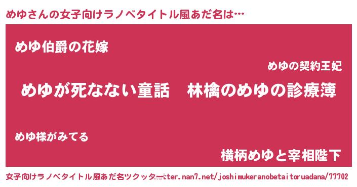| 男性向けラノベタイトル風あだ名 | 『魔弾の王とめゆ』 |