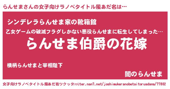 | 男性向けラノベタイトル風あだ名 | 『うちの娘の為ならば、俺はもしかしたららんせまも倒せるかもしれない。』 |