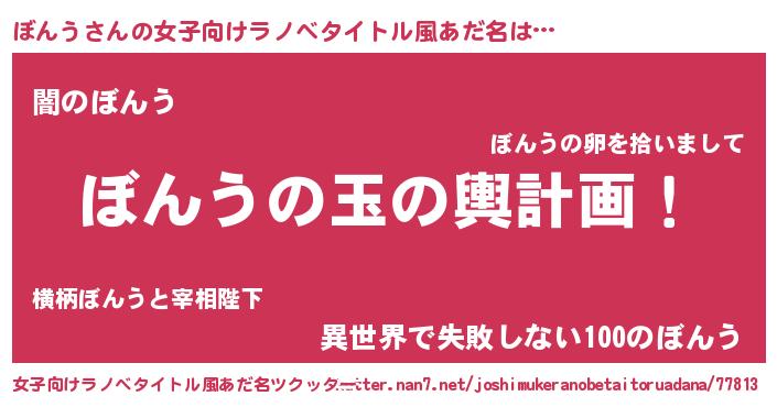 | 男性向けラノベタイトル風あだ名 | 『転生したらぼんうだった件』 |