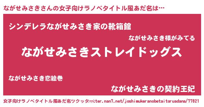ながせみさきさんの女子向けラノベタイトル風あだ名は… 『ながせみさきストレイドッグス』『シンデレラながせみさき家の靴箱館』『ながせみさきの契約王妃』 ツクッター #女子向けラノベタイトル風あだ名ツクッター http://tkutter.nan7.net/joshimukeranobetaitoruadana/77821/