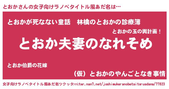 | 男性向けラノベタイトル風あだ名 | 『おまえをオタクにしてやるから、俺をとおかにしてくれ! 』 |