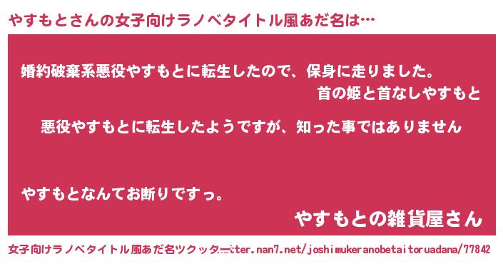 | 男性向けラノベタイトル風あだ名 | 『この素晴らしい世界にやすもとを!』 |