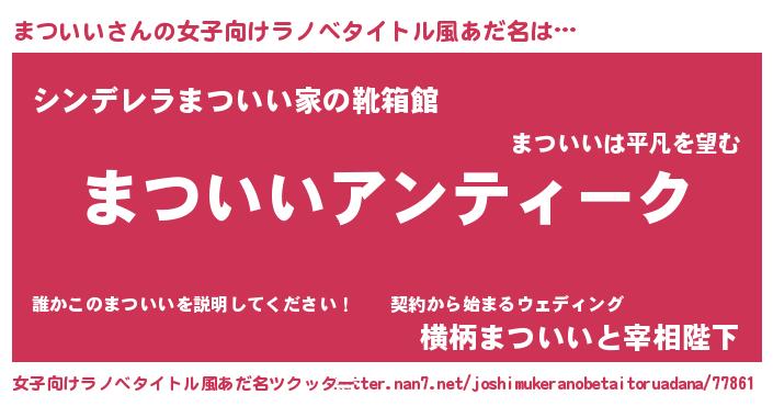 まついいさんの女子向けラノベタイトル風あだ名は… 『まついいアンティーク』『シンデレラまついい家の靴箱館』『横柄まついいと宰相陛下』 ツクッター #女子向けラノベタイトル風あだ名ツクッター http://tkutter.nan7.net/joshimukeranobetaitoruadana/77861/