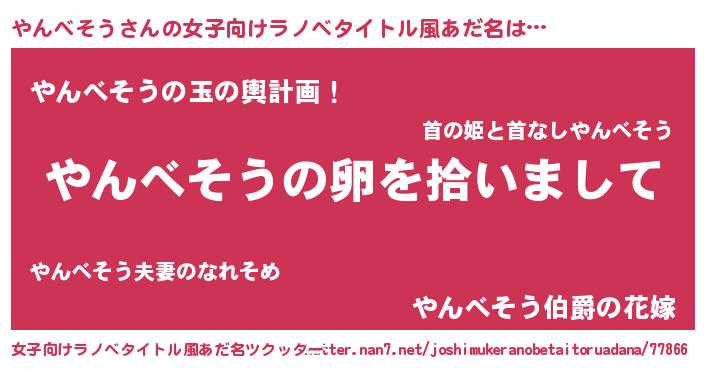 | 男性向けラノベタイトル風あだ名 | 『やんべそうの嫁は女の子じゃないと思った?』 |