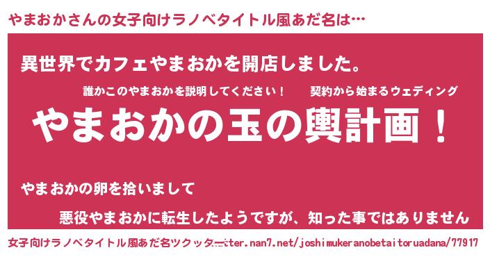 | 男性向けラノベタイトル風あだ名 | 『やまおか~年齢イコール彼女いない歴の魔法使い~』 |