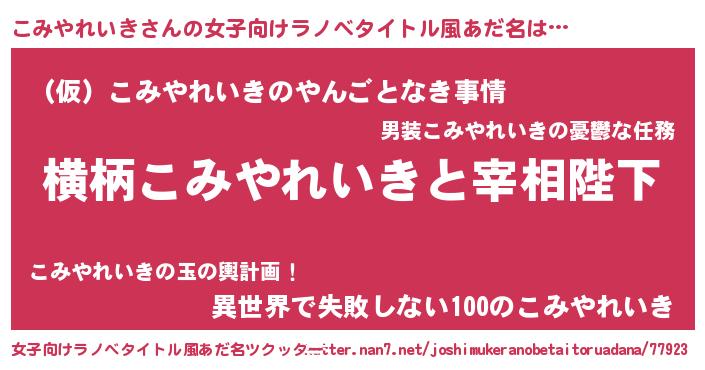 | 男性向けラノベタイトル風あだ名 | 『こみやれいきに滅ぼされるだけの簡単なお仕事です』 |