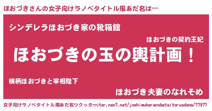 | 男性向けラノベタイトル風あだ名 | 『ほおづき~年齢イコール彼女いない歴の魔法使い~』 |