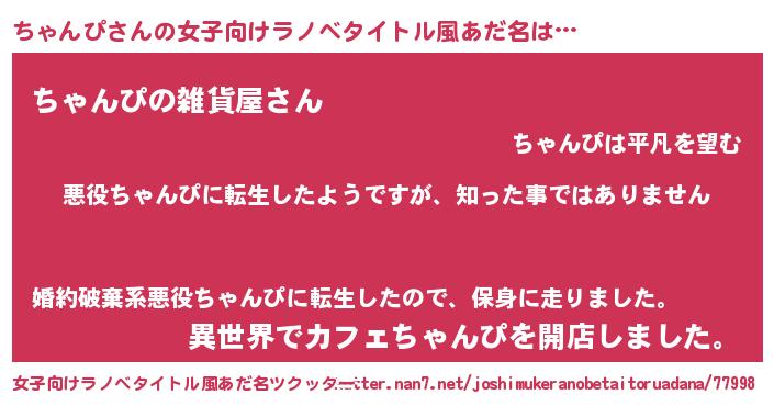 | 男性向けラノベタイトル風あだ名 | 『この素晴らしい世界にちゃんぴを!』 |