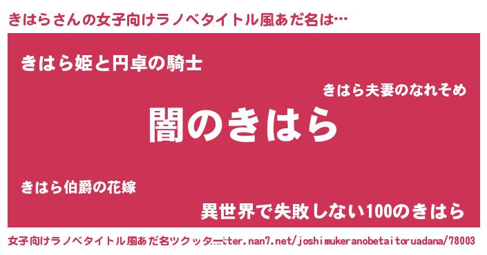 | 男性向けラノベタイトル風あだ名 | 『Re:きはらから始める異世界生活』 |
