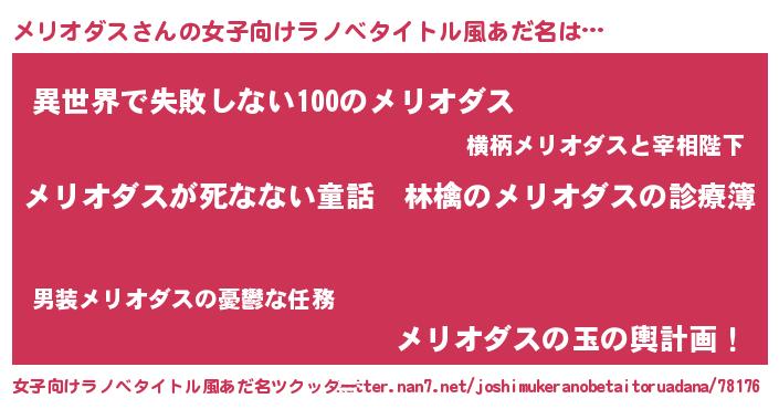 | 男性向けラノベタイトル風あだ名 | 『魔弾の王とメリオダス』 |