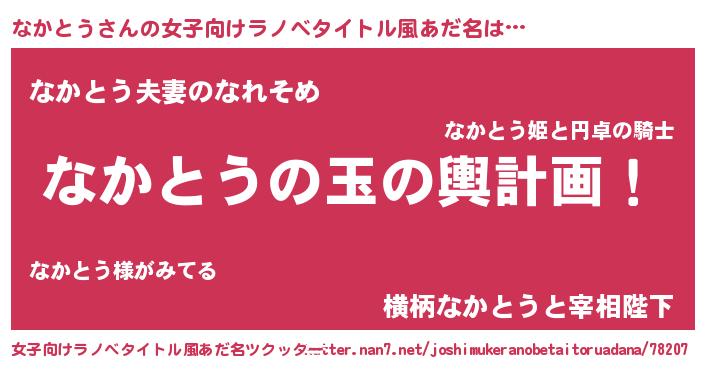| 男性向けラノベタイトル風あだ名 | 『なかとう~年齢イコール彼女いない歴の魔法使い~』 |