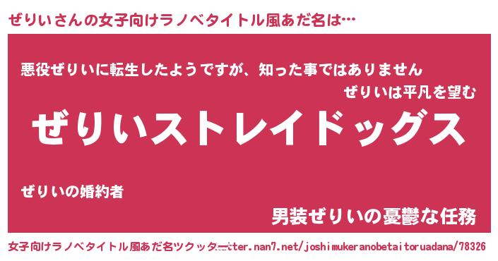 | 男性向けラノベタイトル風あだ名 | 『Re:ぜりいから始める異世界生活』 |
