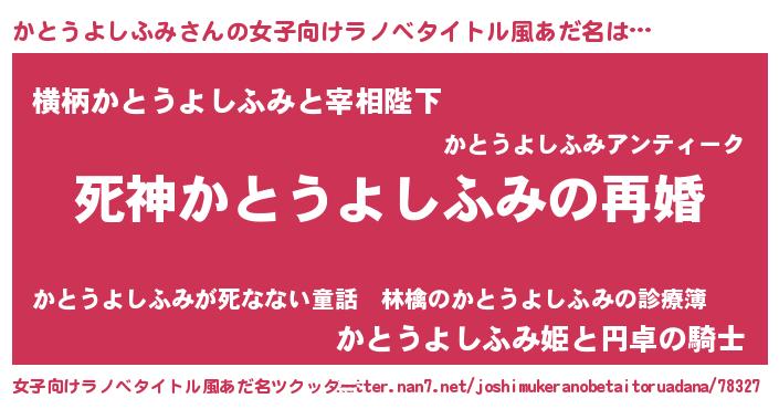 | 男性向けラノベタイトル風あだ名 | 『ノーゲーム・ノーカトウヨシフミ』 |